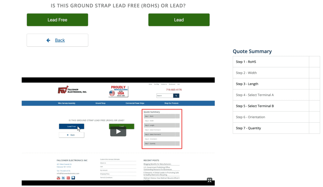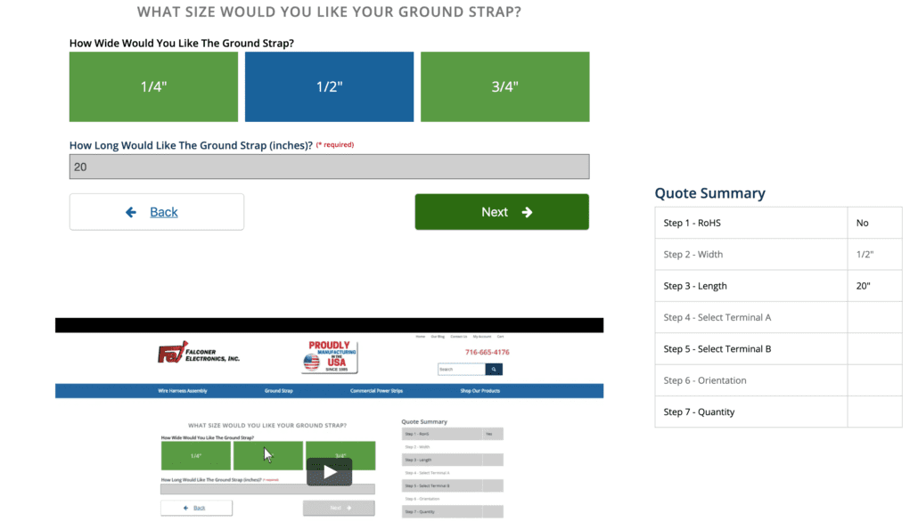 Working with their eCommerce web designer, Falconer Electronics created the Instant Ground Strap QuoteBuilder (https://falconerelectronics.com/instant-ground-strap-quote/).